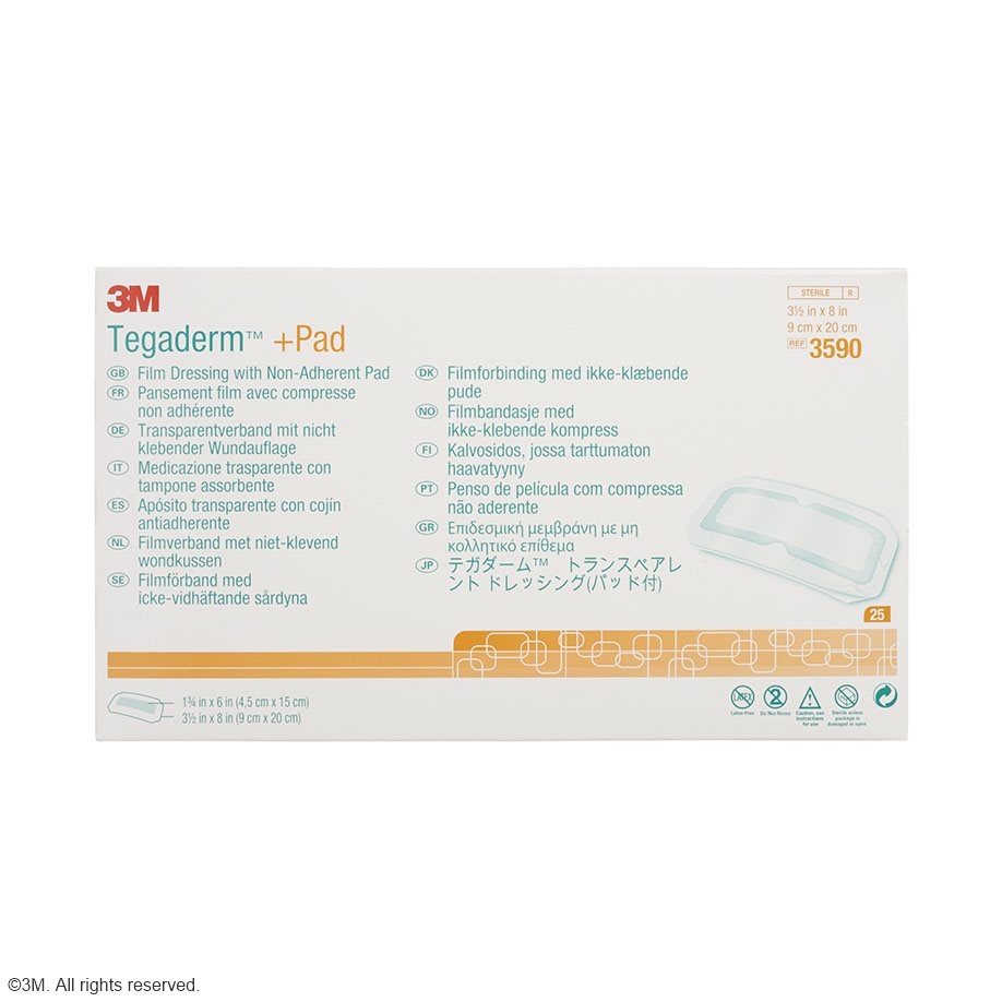 Tegaderm™ + Pad Transparentverband mit absorptionsfähiger Wundauflage ist ein vielseitig verwendbarer, steriler Fertigverband mit den Vorteilen eines Transparentverbandes: wasserdicht, keimdicht, abwischbar (auch mit alkoholischen Desinfektionsmitteln) und doch atmungsaktiv.