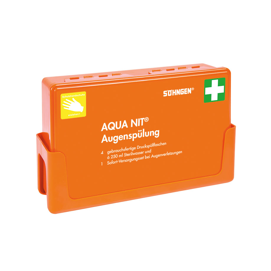 Kann an allen unfallgefährdeten Stellen und Arbeitsplätzen bereitgehalten werden. Hat durch die Wandhalterung immer einen festen Platz, kann mit einem Griff schnell und mühelos aus der Halterung entnommen und an den Unfallort gebracht werden. Es ist im Notfall immer reichlich Augenspülflüssigkeit vor Ort verfügbar, nicht benötigte Augenspülflaschen bleiben unversehrt. Inhalt: 4 gebrauchsfertige Druckspülflaschen, Sofortset für Augenverletzungen mit DuOcul-Augenkompressen, Augenklappe, SÖHNGEN® Silk Pflasterstreifen, DERMOTEKT® Kompresse und Einmal-Schutzhandschuhen. Kunststoffbox ca. 260 x 160 x 80 mm, orange, inkl.Wandhalterung.