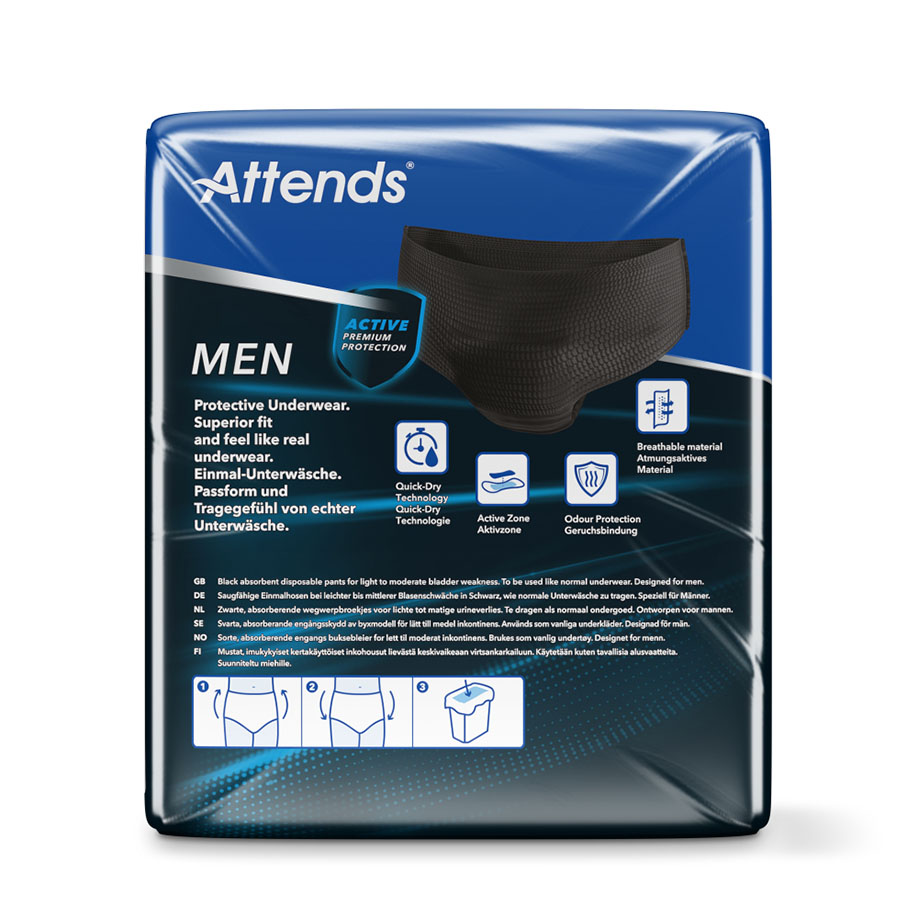 Attends® Men Protective Einmalhosen haben eine besonders diskrete Form. Die saugfähigen Einmalhosen können ganz einfach an- und wieder ausgezogen werden und sind bei leichter bis mittlerer Harninkontinenz geeignet.