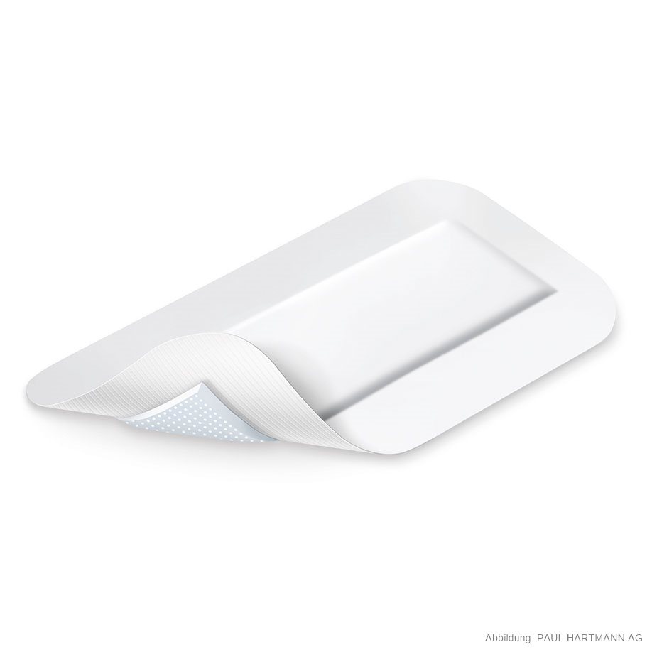 Selbstklebender Wundverband aus weichem Trägervlies und zentralem Wundkissen 16 x 5,5 cm mit DryBarrier® Technologie, einzeln eingesiegelt, die Wundkontaktschicht aus einem feinmaschigen Polyethylen-Netz verhindert ein Verkleben mit der Wunde, eine Transferschicht leitet das Exsudat in die Absorptionsschicht und wird dort dauerhaft gespeichert, um Rücknässung zu vermeiden, sehr gute Saugkapazität und hoch speicherfähig, mit zusätzlichem Polstereffekt, hautfreundlich durch hypoallergenen, synthetischen Kleber.