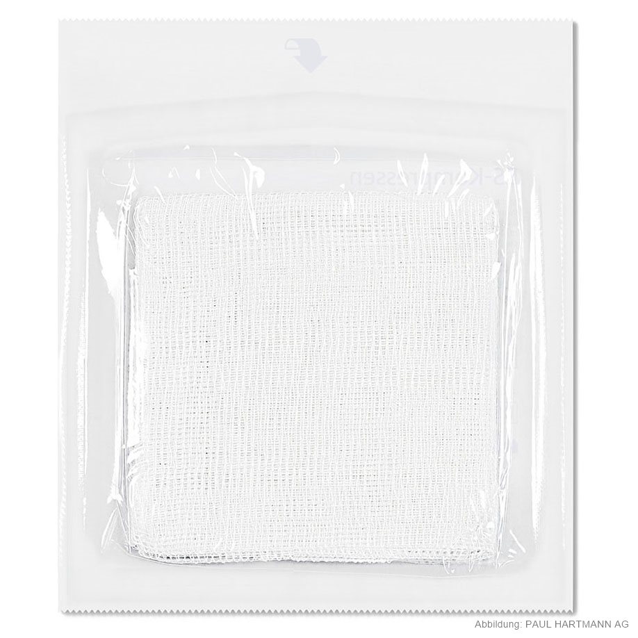 aus Verbandmull EN 14079, 17-fädig, mit eingeschlagenen Schnittkanten (=ES), auch mehrfach aufgeklappt in größeren Formaten verwendbar, ohne dass störende Randfäden auftreten, gute Saugfähigkeit, luftdurchlässig, weich und geschmeidig in Faltschachtel, eingesiegelt zu 2 Stück