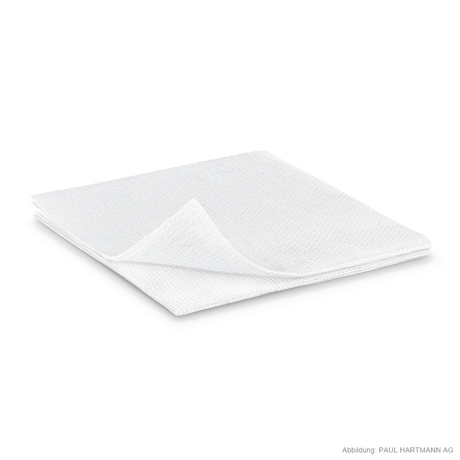 aus Verbandmull EN 14079, 17-fädig, mit eingeschlagenen Schnittkanten (=ES), auch mehrfach aufgeklappt in größeren Formaten verwendbar, ohne dass störende Randfäden auftreten, gute Saugfähigkeit, luftdurchlässig, weich und geschmeidig, in sterilisierbarem Papierbeutel