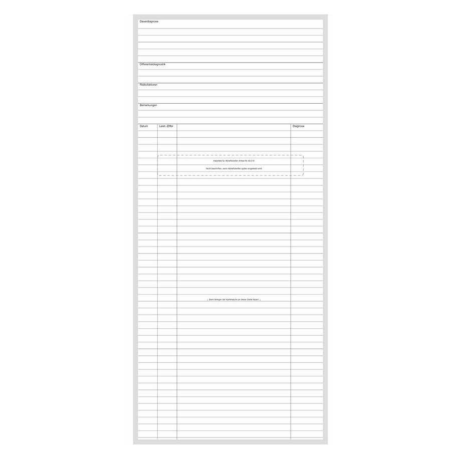 Weiß, 180 g Computerkarton, holzfrei, extra zäh, 4 Quernutungen (1 x oben, 3 x unten), plan verpackt, Adressfeld gemäß eGK, Klebefeld für Abheftstreifen (Artikel-Nr. 60.010), Linierung 7 mm. Wird zur Anwendung 2 x gefaltet. Maße aufgeklappt 442 x 210 mm, gefaltet bis 164 x 210 mm.