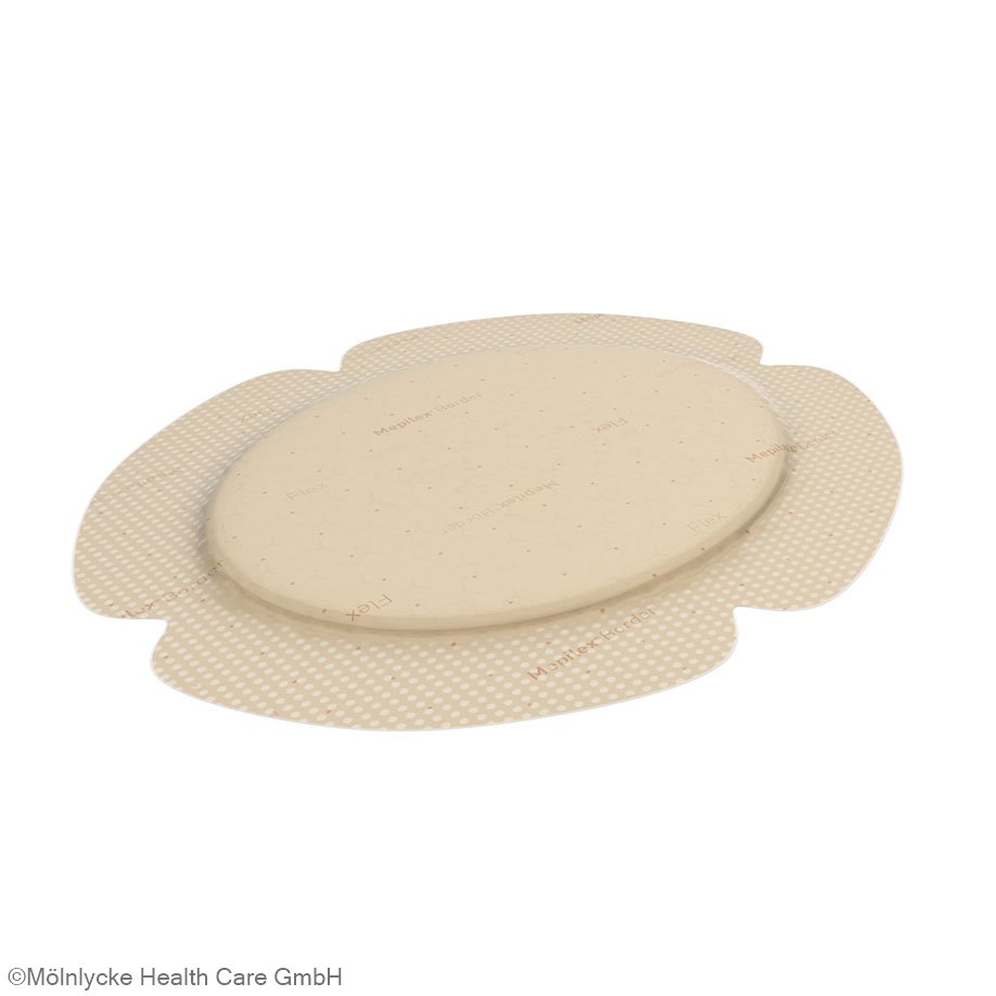Mepilex® Border Flex Oval ist ein flexibler All-in-one-Schaumverband für eine Vielzahl von Wunden, z. B. Dekubitus, Bein- und Fußgeschwüre sowie traumatische Wunden. Die Flex-cut-Perforation von Mepilex® Border Flex Oval und die Form der Ränder sorgen für eine gute Anpassbarkeit und ein zuverlässiges Haftungsvermögen des Verbandes. Da sich der Verband gut an die Körperkonturen anpassen lässt, sinkt das Risiko eines vorzeitigen Ablösens.