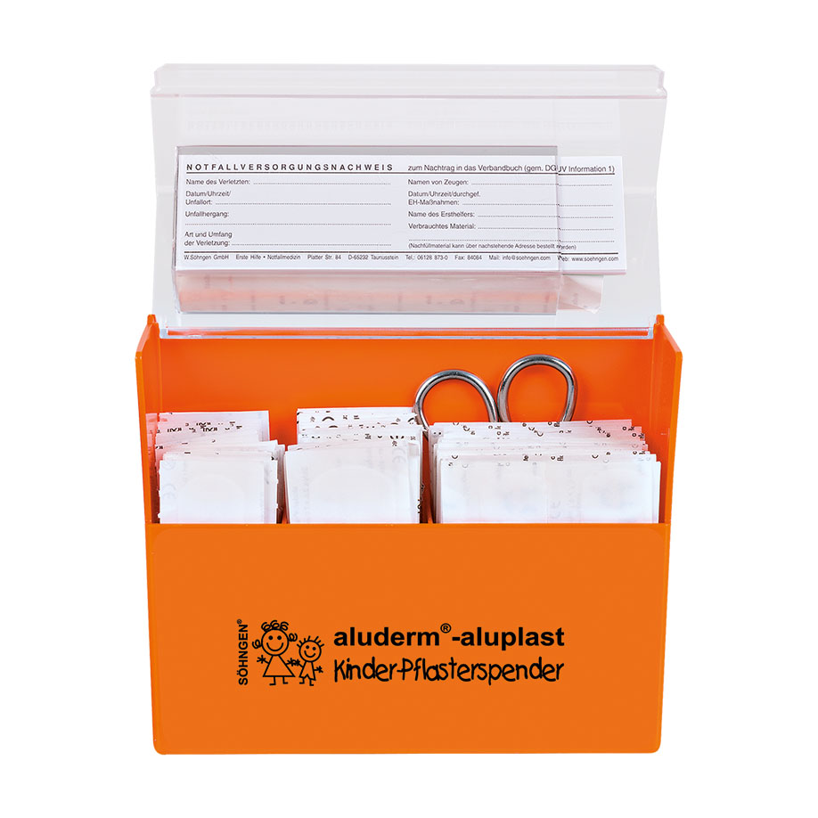 Pflasterspender ca. 160 x 122 x 57 mm, inkl. Wandhalterung und Befestigungssatz, ABS-Kunststoff orange, mit drei Fachabteilungen. Transparentdeckel mit Tunnelfach. Übersichtliche, hygienische Aufbewahrung, bedarfsgerechte Entnahme und einfaches Nachfüllen der verschiedenen Pflasterwundverbände. Die aluderm®-aluplast Wundpflaster sind einzeln hygienisch eingesiegelt - so wird nicht nur die Hygiene gewahrt, auch Lagerfähigkeit und Haltbarkeit werden erhöht. Inhalt: 115 Wundpflaster, Miniblock Notfallversorgungsnachweis, Schere ca. 10 cm lang.