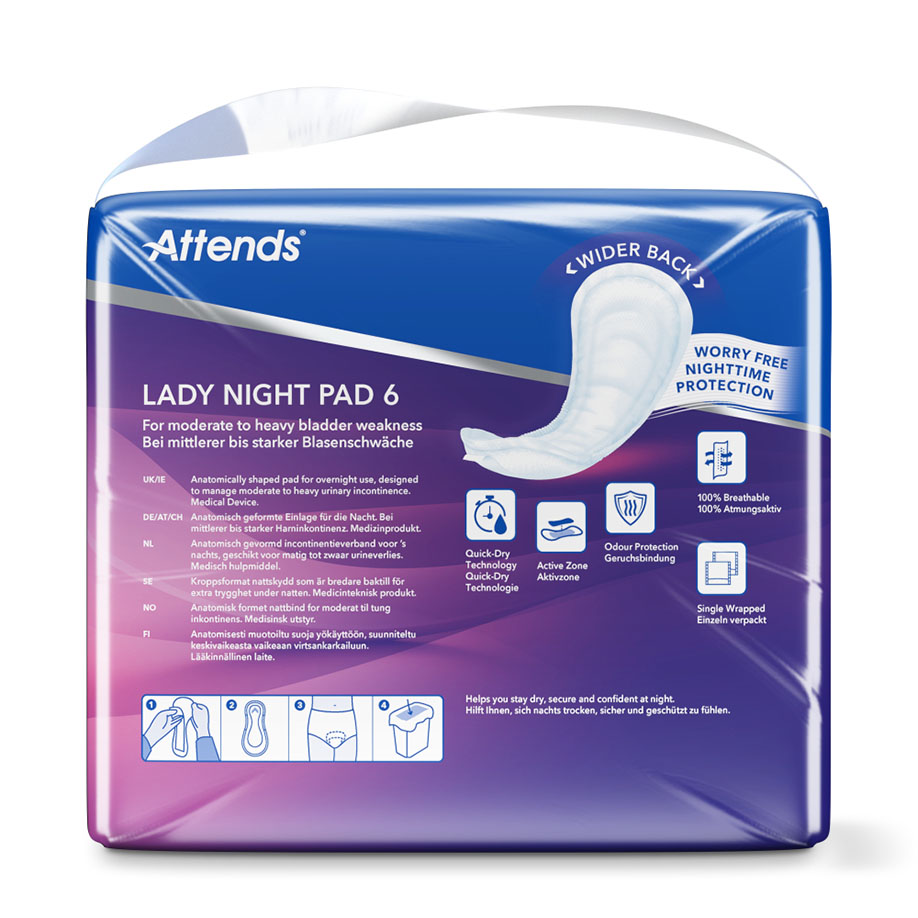 Attends® Lady Night Pad 6 are soft pads especially for the night. They are wider at the back thus providing additional protection when lying down. They are suitable for moderate to severe urinary incontinence.