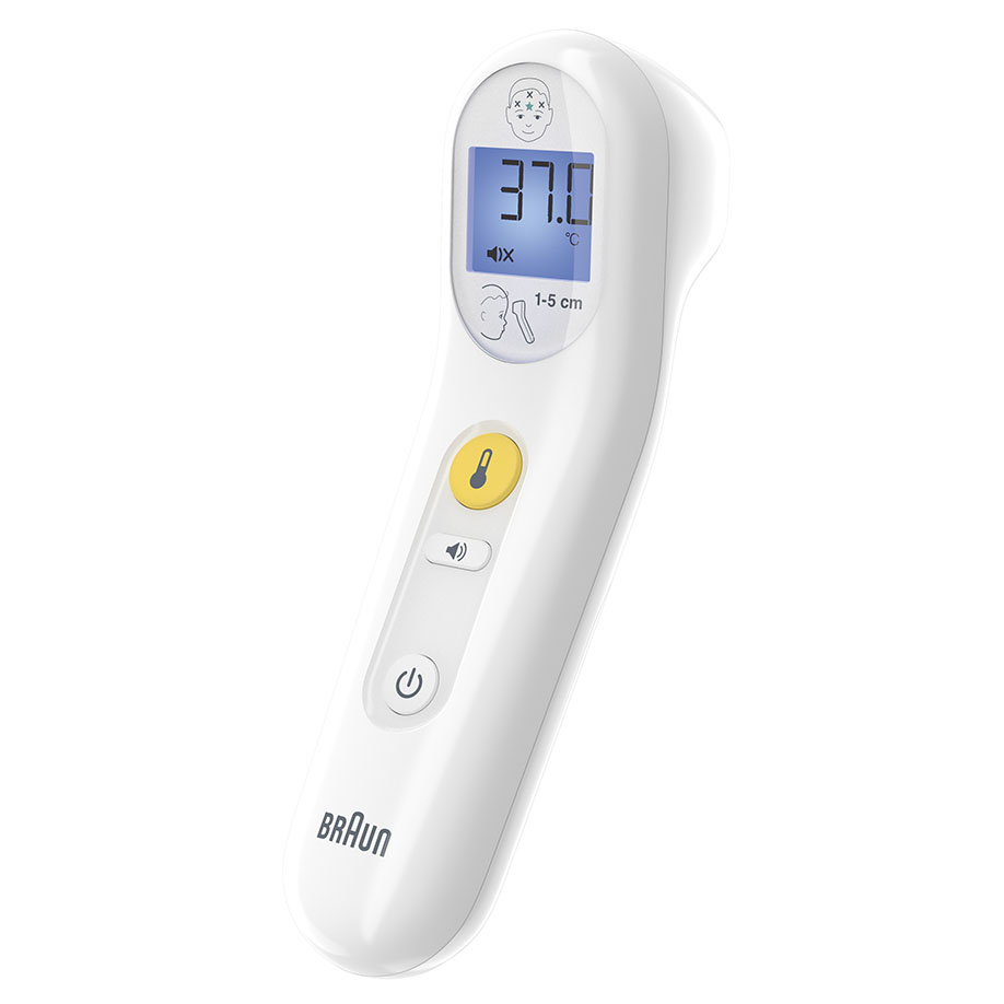 The Braun Sensian™ 3 forehead thermometer for home use measures the infrared heat emitted from the skin in the centre of the forehead, directly above the eyebrows, without touching the skin. This energy is collected by the lens and converted into an oral equivalent.