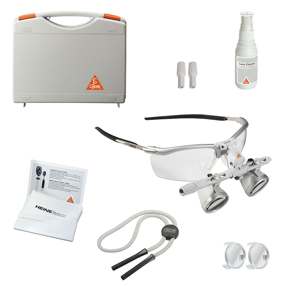 Set A: HR 2.5 x optics with i-View on S-FRAME, protective lenses, 2 sterilisable swivel levers, retaining cord, cleaning fluid, cleaning cloth and carrying case