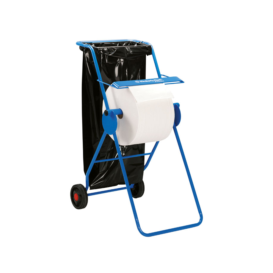 Mobile and mountable rolled wiper dispensers for wide paper towel rolls, for quickly and easily dispensing paper wipers from a large roll, available as: a large, sturdy, blue tubular steel dispenser that can be wheeled around as a free-standing unit, with a bin bag attached for waste disposal and a stop pedal for safety. Dimension: 109 x 50 x 74 cm, for Kimberly products: 38664, 38666, 7623, 7643, 47658, 6036, 6063, 7140, 7153, 7200, 7202, 7210, 7214, 7224, 7238, 7240, 7241, 7247, 7248, 7249, 7300, 7301, 7317, 7331, 7356, 7359, 7425, 7426, 7452, 7454, 7472, 7473, 7474, 7476, 7477, 8356, 8371, 8374, 8377, 8384, 8389 und 12889