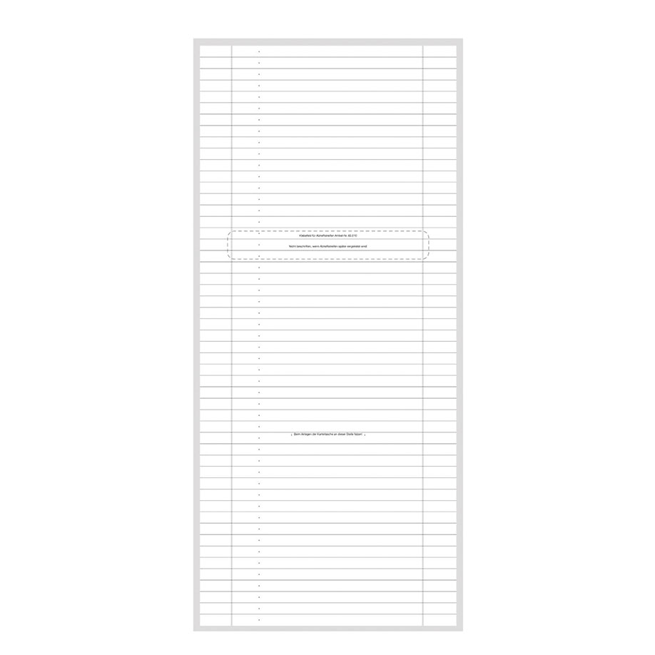 White, 180 g computer cardboard, wood-free, extra tough, 4 cross-scoring lines (1 x top, 3 x bottom), flat packed, address field in accordance with eGK, adhesive field for filing strip (item no. 60.010), 7 mm ruling. Folded twice for use. Dimensions unfolded 442 x 210 mm, folded to 164 x 210 mm.