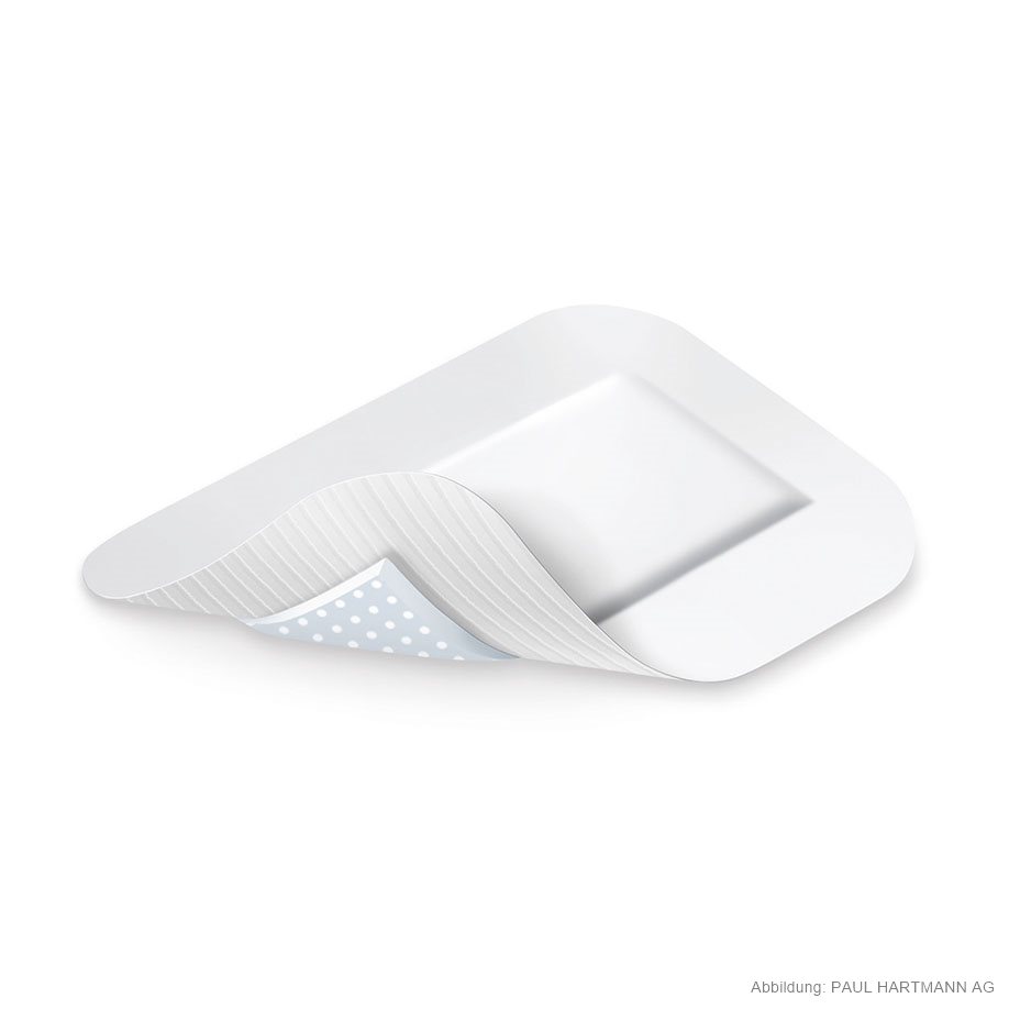 Self-adhesive wound dressing made of soft non-woven carrier material and central absorbent wound pad 4 x 2.5 cm with DryBarrier® Technology, individually sealed, the wound contact layer made of fine-meshed polyethylene net fabric prevents sticking to the wound, a transfer layer passes the exudate into the absorption layer and stores it there in order to prevent rewetting, very high absorption and storage capacity with an additional good padding effect, kind to the skin due to a hypoallergenic, synthetic adhesive.