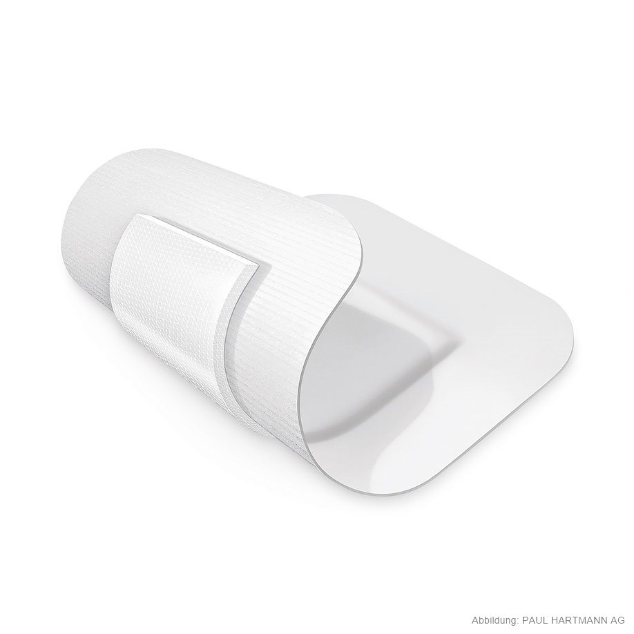 Self-adhesive wound dressing made of a soft non-woven fabric as support material, with a wound dressing pad (5.5 x 5.5 cm) covered with a non-adherent microgrid wound-contact layer, individually sealed, highly absorbent and good padding effect, rapid drainage of exudate through to the microgrid layer, skin-friendly through a hypoallergenic polyacrylate adhesive.