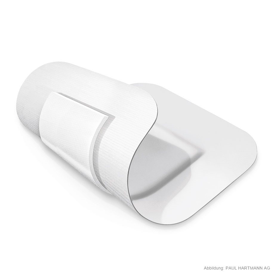 Self-adhesive wound dressing made of a soft non-woven fabric as support material, with a wound dressing pad (10 x 10 cm) covered with a non-adherent microgrid wound-contact layer, individually sealed, highly absorbent and good padding effect, rapid drainage of exudate through to the microgrid layer, skin-friendly through a hypoallergenic polyacrylate adhesive.