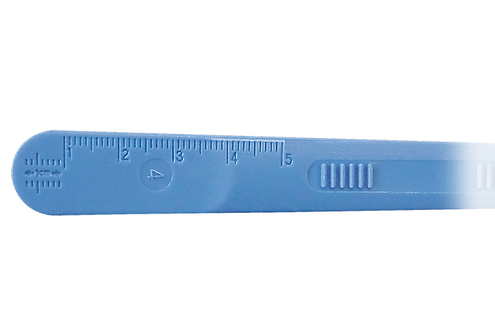 stainless steel blades, ergonomic plastic handle with centimetre markings and plastic cap over the blade for increased safety, individually packaged in soft-blister packaging