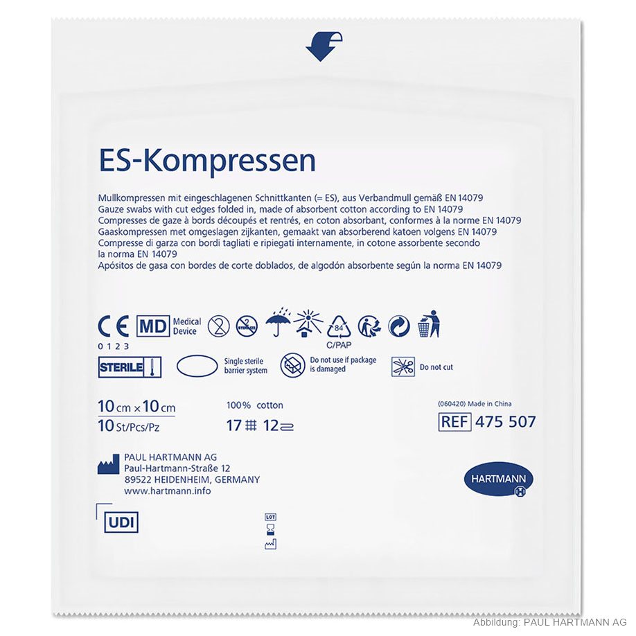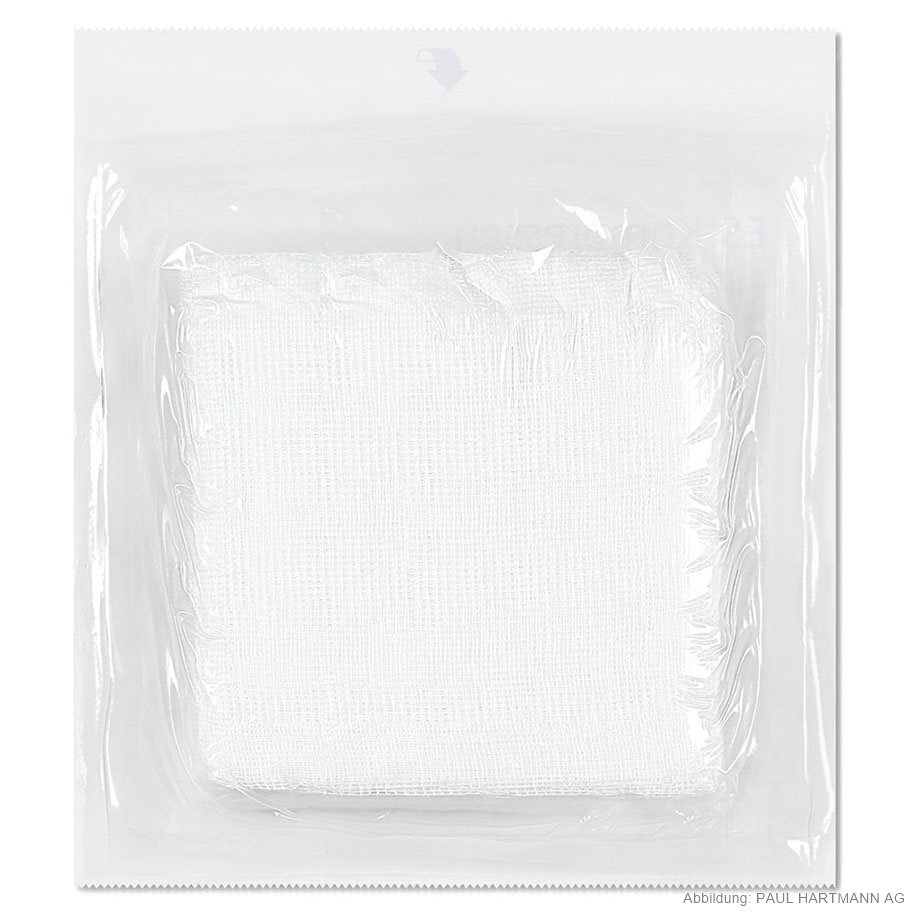 Made of absorbent cotton gauze according to EN 14079, 17 threads, with cut edges folded in (= ES), in box sealed in pack of 10 pieces