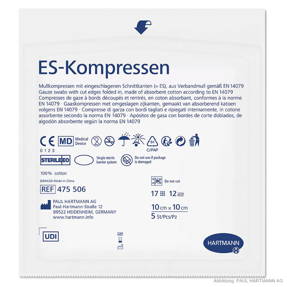 Made of absorbent cotton gauze according to EN 14079, 17 threads, with cut edges folded in (= ES), in box sealed in pack of 5 pieces