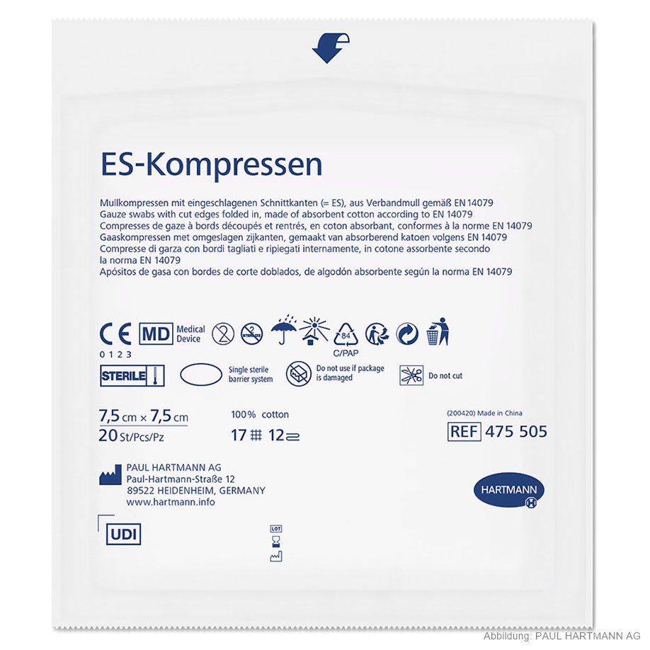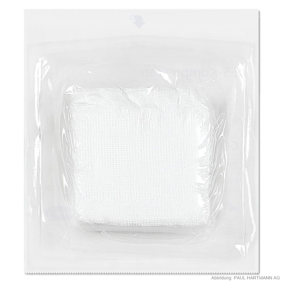 Made of absorbent cotton gauze according to EN 14079, 17 threads, with cut edges folded in (= ES), in box sealed in pack of 20 pieces