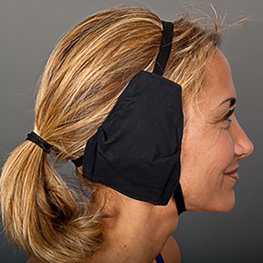 The black ear bandage is triangular in shape and made of fabric with sewn-on straps to securely hold compresses in place around the ear. The ear bandage is individually packaged for hygiene.