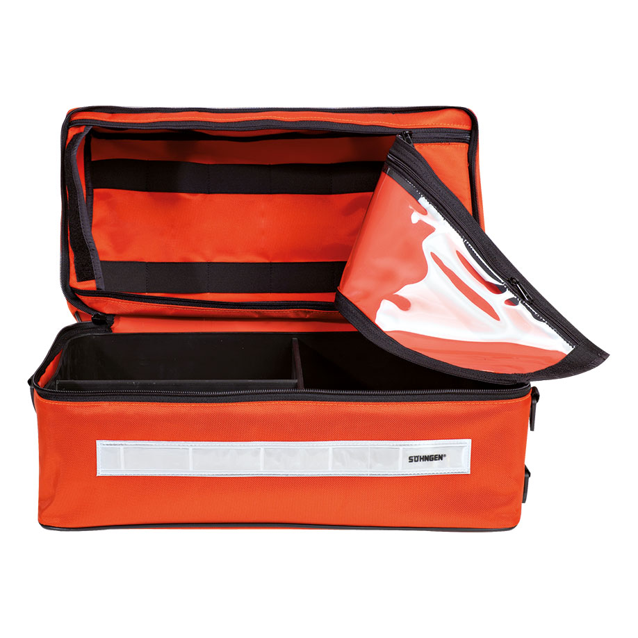 Size 290 x 490 x 260 mm. Made from a sturdy nylon fabric, it is water and tear resistant. Orange in colour, with carrying belts, handles and black double zip closing facility. The base of the bag is 120 mm deep and is zip opened. Strong plastic frame with different compartments allows for a better product overview. The upper part of the holdall also opens using a strong zip. The inner parts are equipped with velcro fasteners, rubber storage loops and pockets for the storage of small materials.