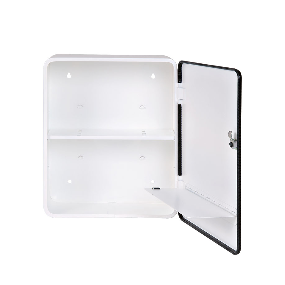 Dimensions approx. 302 x 362 x 140 mm. White, one door with locking facility. The inside partitioning can be extended by one additional shelf, two drawers and one medicine compartment.