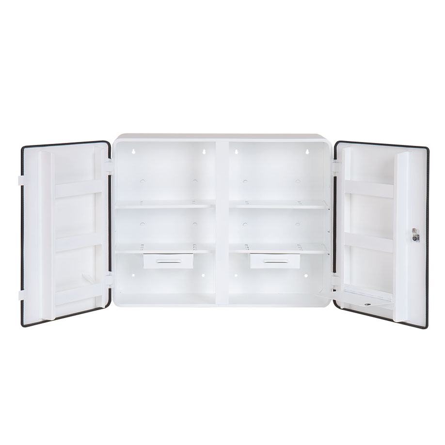 Dimensions approx. 604 x 462 x 170 mm. White, two doors, four shelves and two drawers, lockable. Each door has three storage compartments on the inside. The inside partitioning can be extended