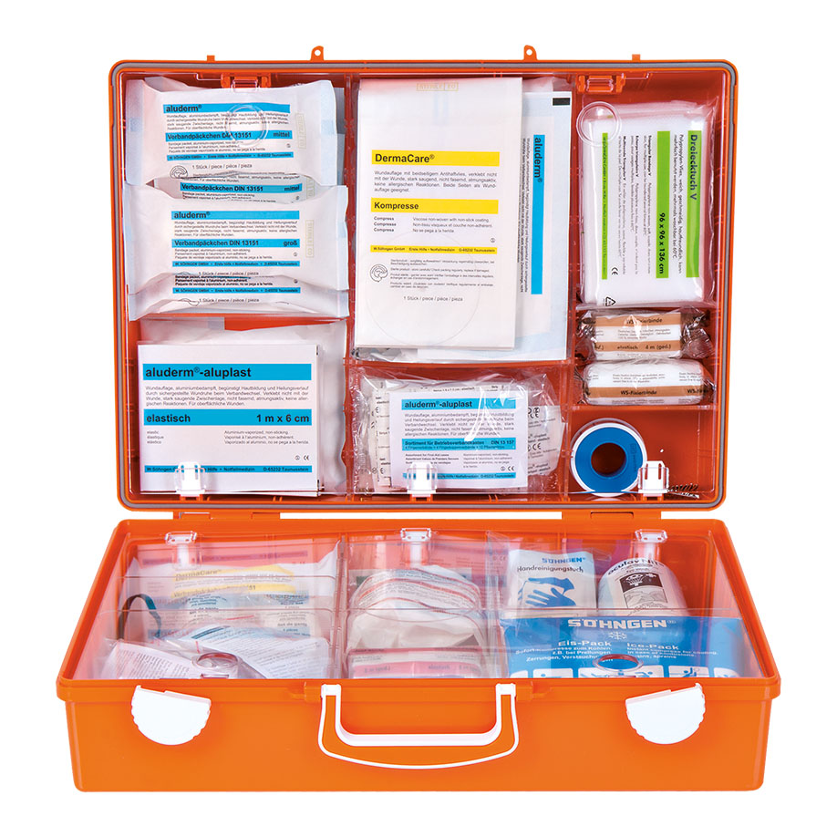 Case MT-CD, approx. 400 x 300 x 150 mm, orange. Wall bracket with 90° stopp-arrest facility. With screenprint labelling and colour pictograms. The Case contain aluderm® and DermaCare®-compresses, various dressings, triangular dressing, net dressing, various WS-bandages, first aid scissors, forceps, hyperventilation mask, AQUA NIT® solution for eye wash, Sirius rescue sheet, special pressure bandages, Air-Vita® Bi-Protect.
