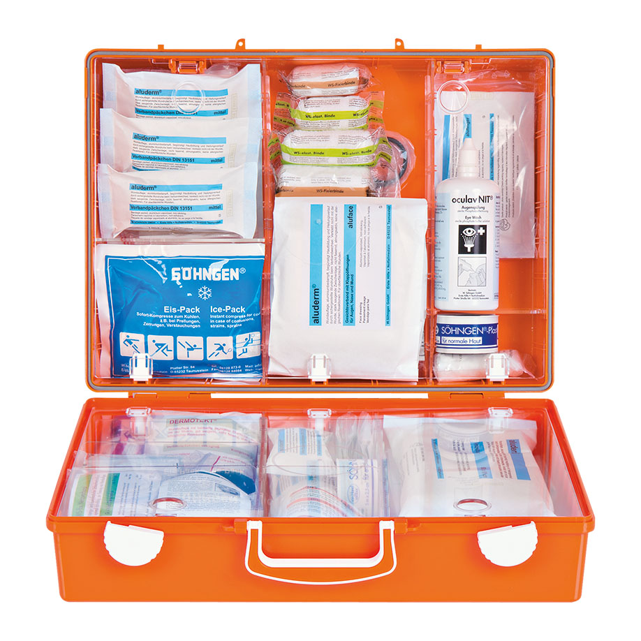 Approx. 400 x 300 x 150 mm, ABS-materiall, colour orange, high grade ABS material, high mechanical and tensile solidity, temperature resistance, splashproof and a high chemical resistance, maintenance-free, internal transparent lids so the products are held securely in place, rubber sealing prevents the entry of dust or dirt thus ensuring a hygienic environment, flexible inner partitioning, rotary locks, reinforced carrying handle, security seals, wall bracket with 90° stop-arrest facility, screened lettering and coloured pictograms. With filling DIN 13157 plus job-related contents.