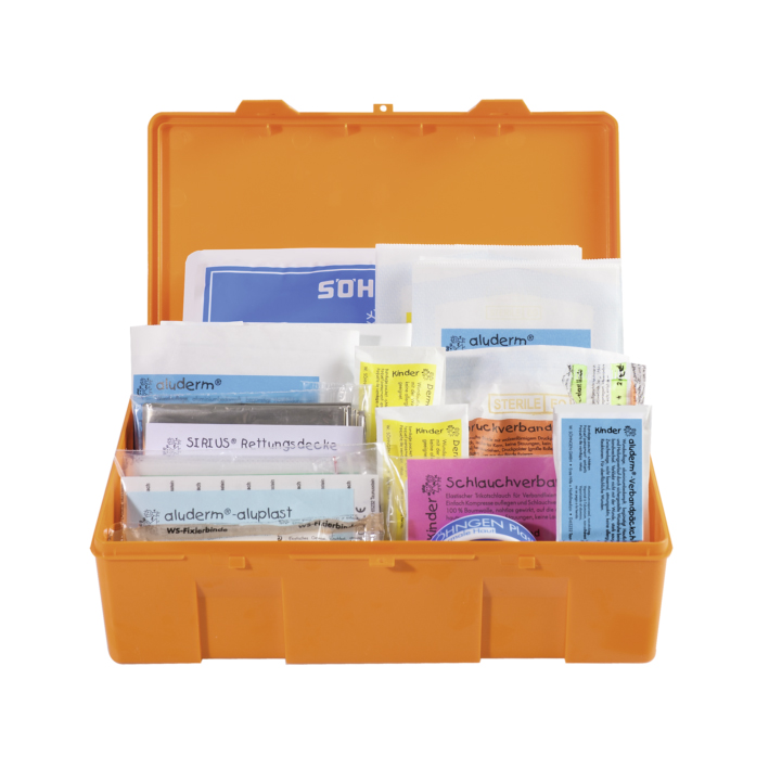 Approx. 260 x 160 x 80 mm, made of ABS-thermoplastic, orange, lid with hinge and clip locks. Screened lettering and colour pictogram. First Aid Case with filling kindergarten, dressing materials in kid's sizes.