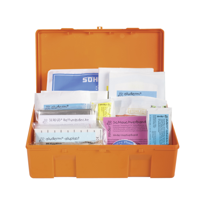 Approx. 260 x 160 x 80 mm, made of ABS-thermoplastic, orange, lid with hinge and clip locks. Screened lettering and colour pictogram. First Aid Case school for schoolchildren of all ages.