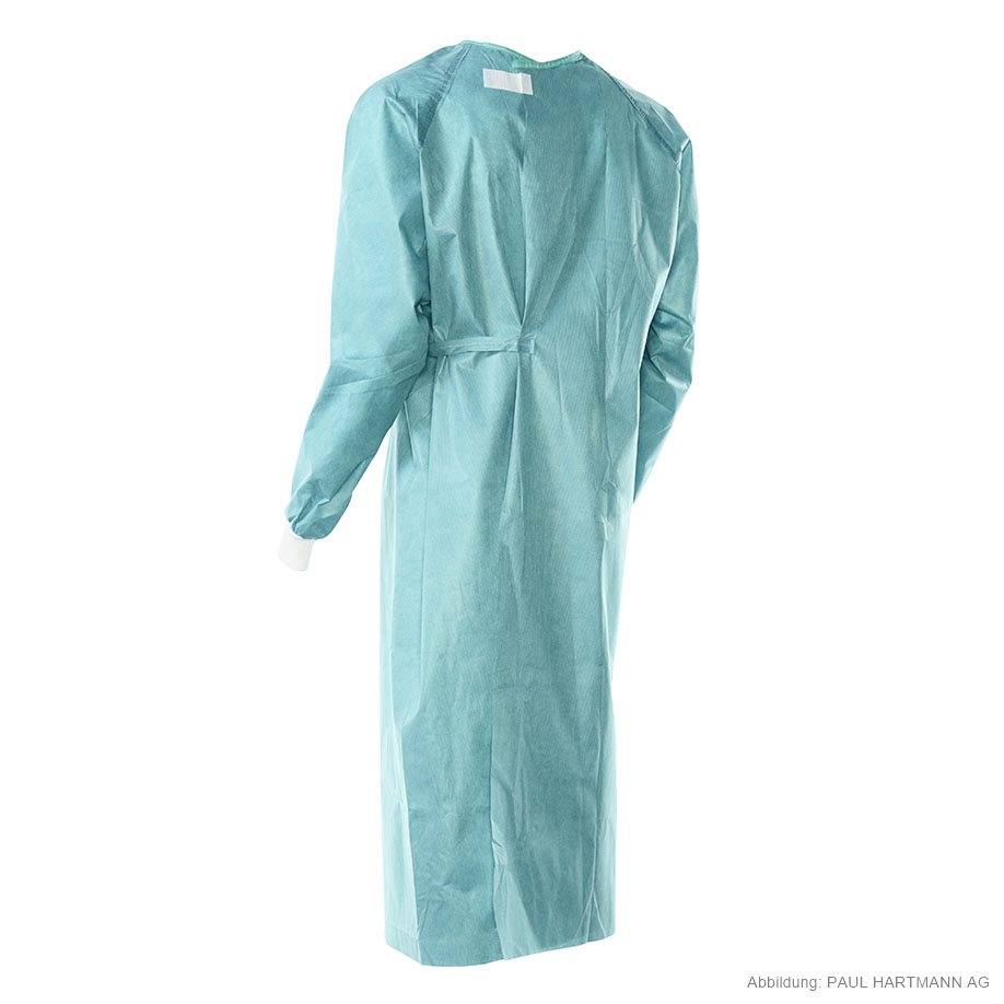Surgical wrap-around gown with raglan sleeves and extra-wide overlapping at the back, with patent-pending Combitape® closing system to flexibly and securely adjust the neckline of the gown for an improved fit, green neckline indicating standard performance level for easier identification of the gown's protection level, for operations involving slight to moderate amounts of fluids. With SMS wrapping and paper towels or as peel and go version without SMS-wrapping and paper towels, individually packed.