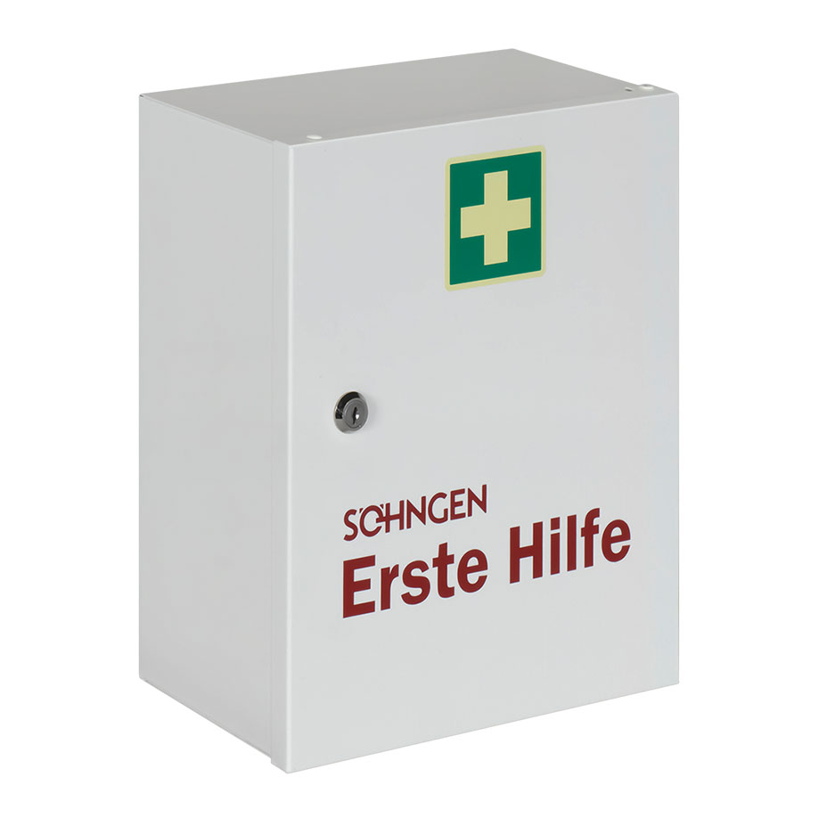 Measuring approx. 302 x 362 x 140 mm, white, one door with locking facility, complete with screened lettering and colour pictograms. The inside partitioning can be extended by one additional shelf, two drawers and one medicine compartment.