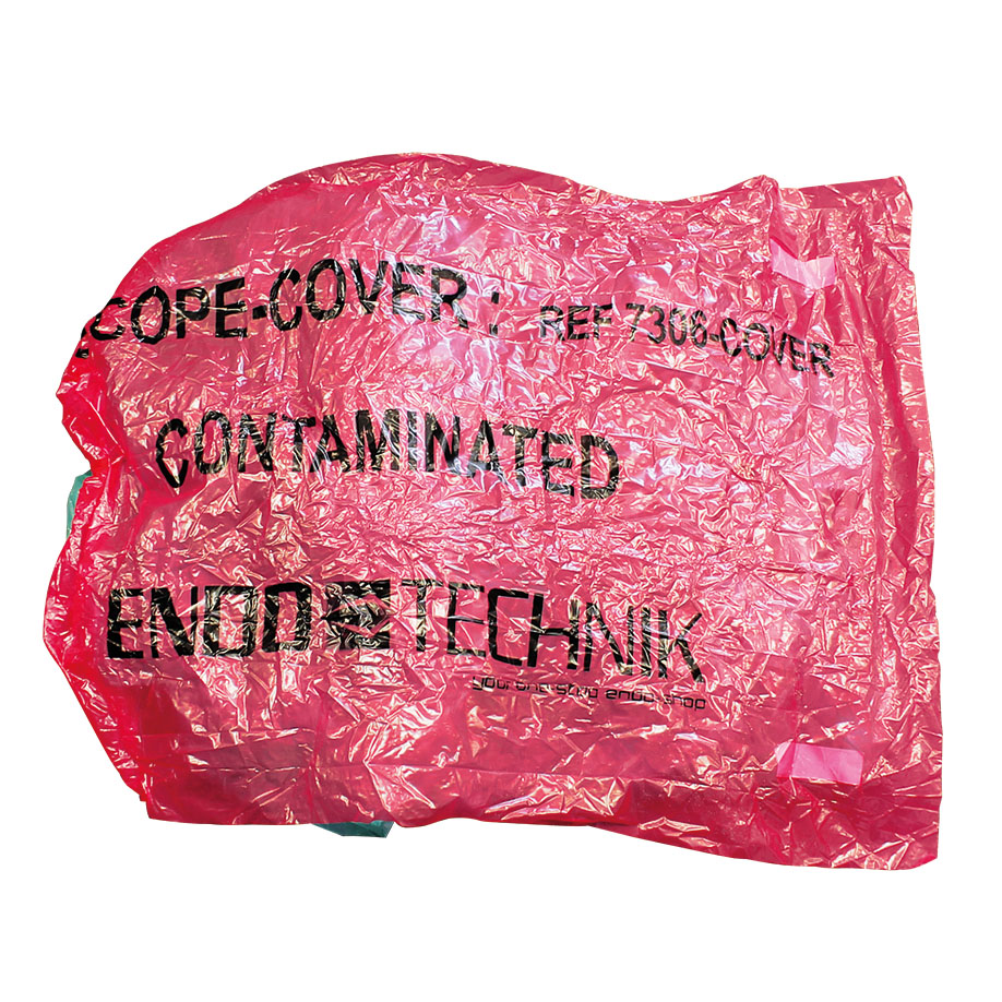 Die Wanne wird mit einem schützenden SCOPE:COVER bestückt, das zur Unterscheidung von desinfizierten und kontaminierten Endoskopen aus einem grünen Folienbeutel und einem roten Folienteil besteht. Der grüne Folienbeutel des Covers ist deutlich mit “CLEAN“ markiert, der rote - mit “CONTAMINATED“ markierte Folienteil - ist darunter verstaut. Nachdem das aufbereitete Endoskop in die Wanne eingelegt ist, wird diese mit dem grünen Folienbeutel überzogen. Ein benutztes