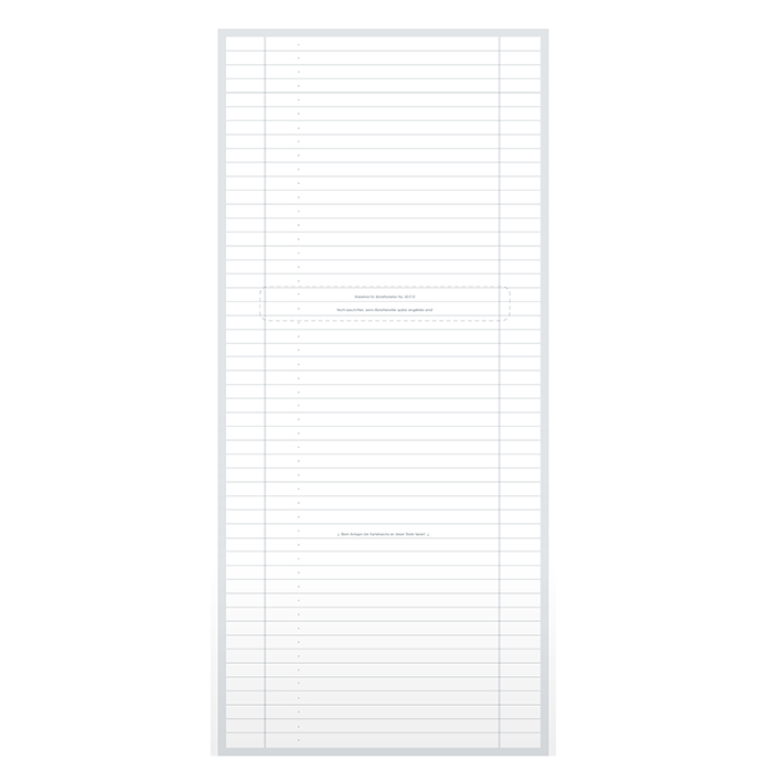 Weiß, 180 g Computerkarton, holzfrei, extra zäh, 4 Quernutungen, 1 x oben, 3 x unten, plan verpackt. Standard-Adressfeld, Klebefeld für Abheftstreifen (Artikel-Nr. 60.010), Linierung 8,5 mm. Wird zur Anwendung 2 x gefaltet. Maße aufgeklappt 442 x 210 mm, gefaltet bis 164 x 210 mm.
