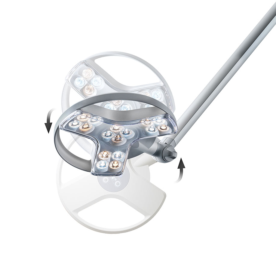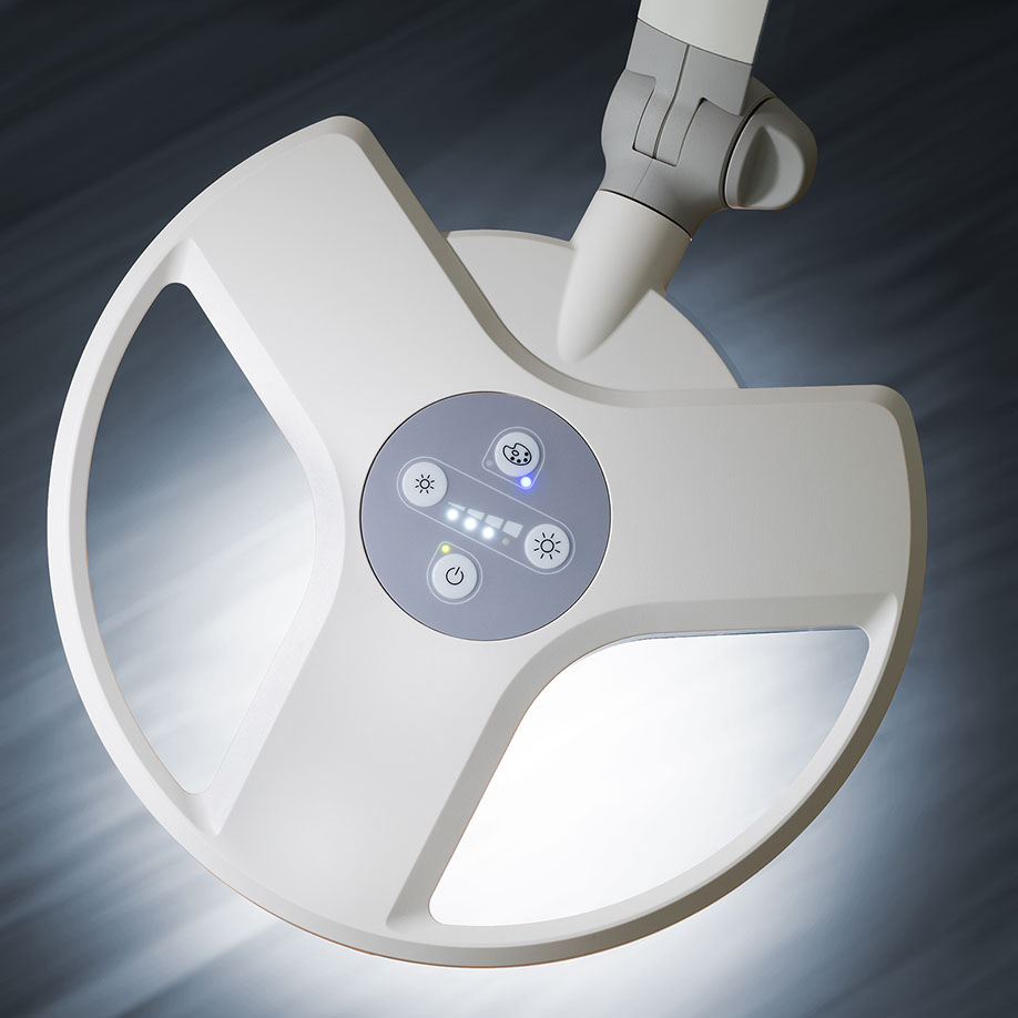 The VISIANO 20-2 P TX examination light offers optimal vision thanks to 60,000 lux at a distance of 50 cm. The specially developed VISO spring arm system makes it easy to align. The closed construction of the lamp head prevents dust and liquids from penetrating. The model has 2 colour temperatures, 4 dimming levels, a rotary feed-through (360° turnover axis) and is antimicrobial. Fields of application: General medicine, dermatology,gynaecology, urology, neonatology and anaesthesia. But it also supports intensive care, emergency and operating theatre preparation with its very good illumination and LEDs in two different light colours.