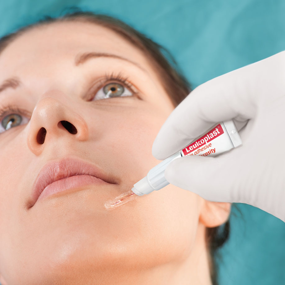 Leukoplast® skin adhesive is a sterile, viscous skin adhesive for topical skin closure. The high viscosity enables precise application of Leukoplast® skin adhesive and reduces the risk of the skin adhesive accidentally running into unwanted areas. With only one adhesive layer, the skin adhesive ensures quick and easy application and adapts flexibly to the skin. Leukoplast® skin adhesive has a 2-in-1 applicator for a versatile range of applications. The fine side of the applicator is suitable for precise wound closure. The wide side can also be used to apply a broad protective film by gripping around it.