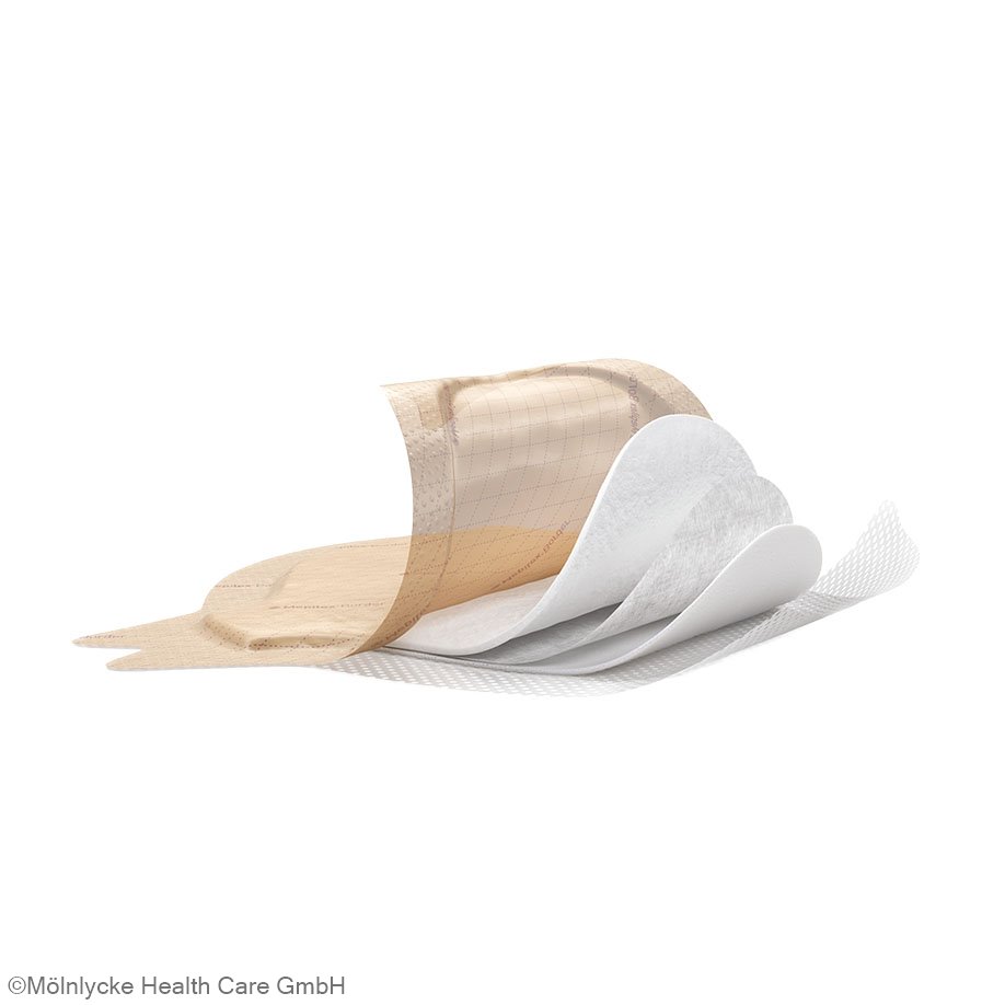 Mepilex® Border Sacrum is a covering, self-adhesive, highly absorbent foam dressing for the treatment of wounds with medium to heavy exudation.