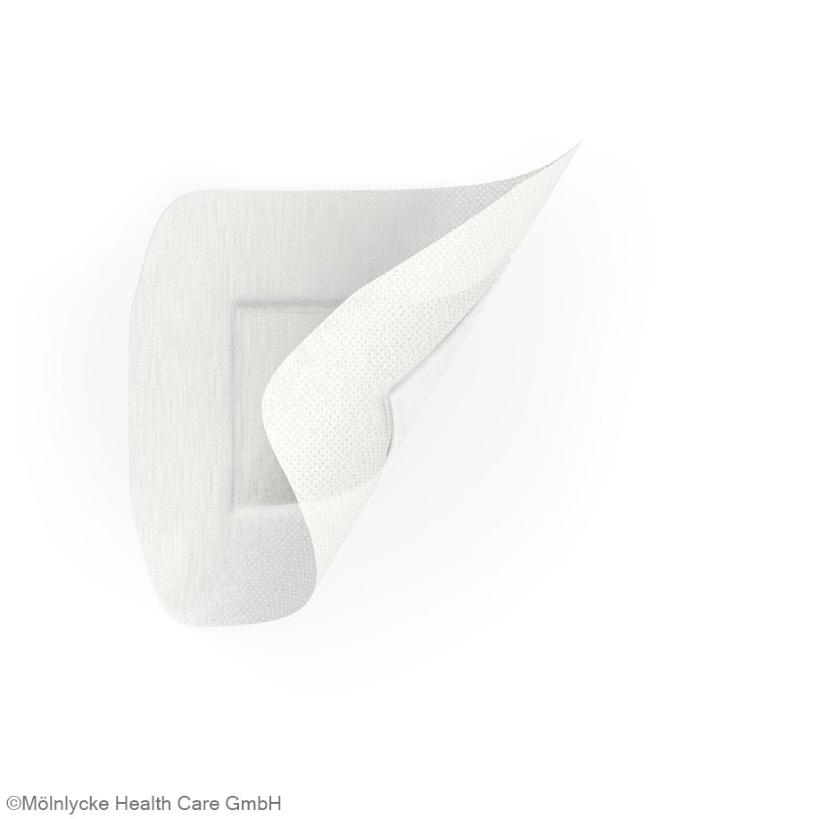 Mepore is a self-adhesive absorbent dressing that has an absorbent wound pad located centrally on a piece of apertured, non-woven polyester fabric coated with a layer of an acrylic adhesive. The wound pad is made of a viscose nonwoven coated with a polyolefin layer to give a smooth surface and render it low-adherent. The polyester backing makes the product permeable and highly flexible, allowing it to conform well to body contours. The dressing is protected by two pieces of overlapping release film which are easy to remove and allows for aseptic application. Mepore is available in a range of sizes and is suitable for many types of lightly exuding superficial or postoperative wounds, particularly those on joints or awkward body contours.