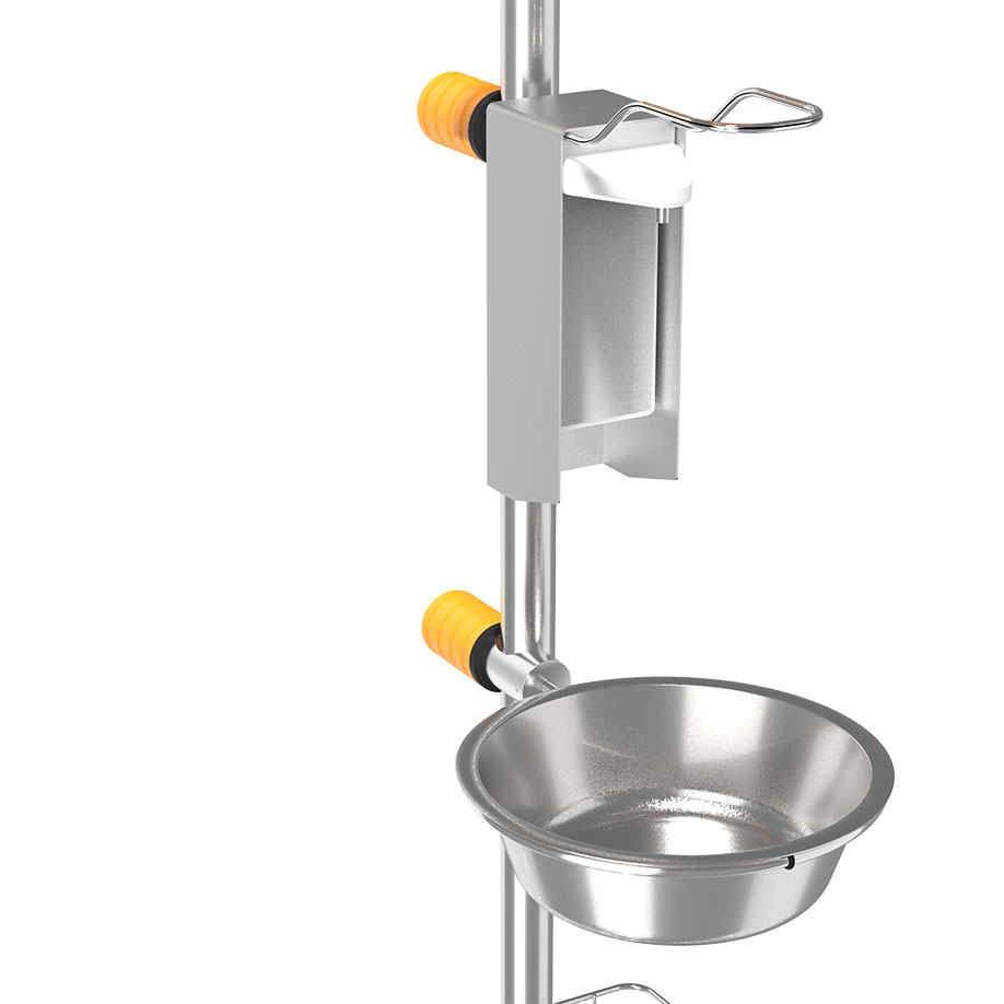 Equipment: 2-fold glove holder, small stainless steel sterile goods basket (W 300 x D 200 x H 100 mm), disinfectant dispenser for 500 ml bottles, 2 litre drip tray, stainless steel storage basket (W 460 x D 460 x H 150 mm). Components are equipped with a quick-release clamp or universal claw.