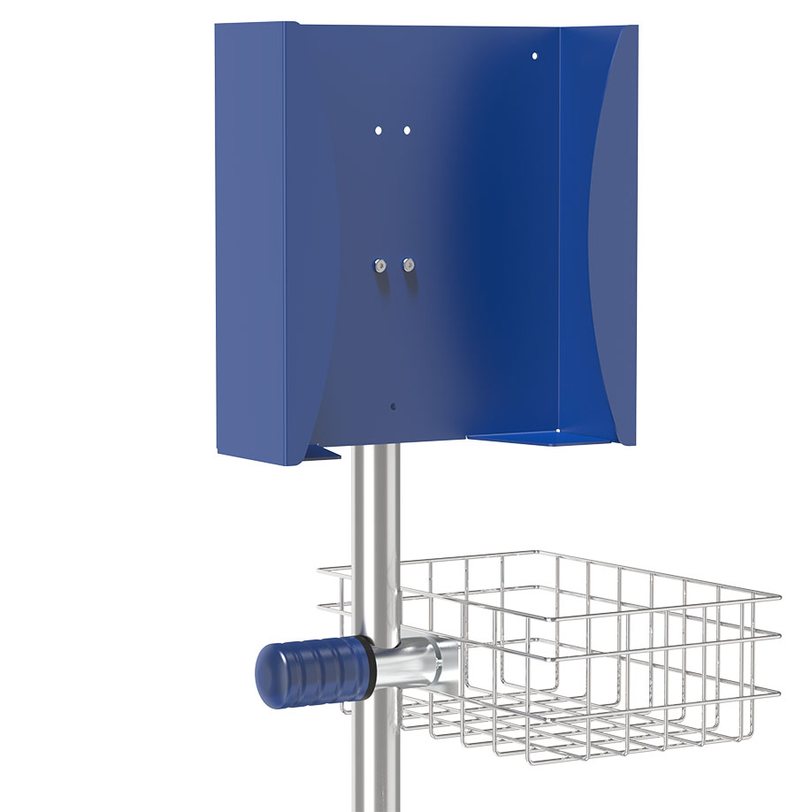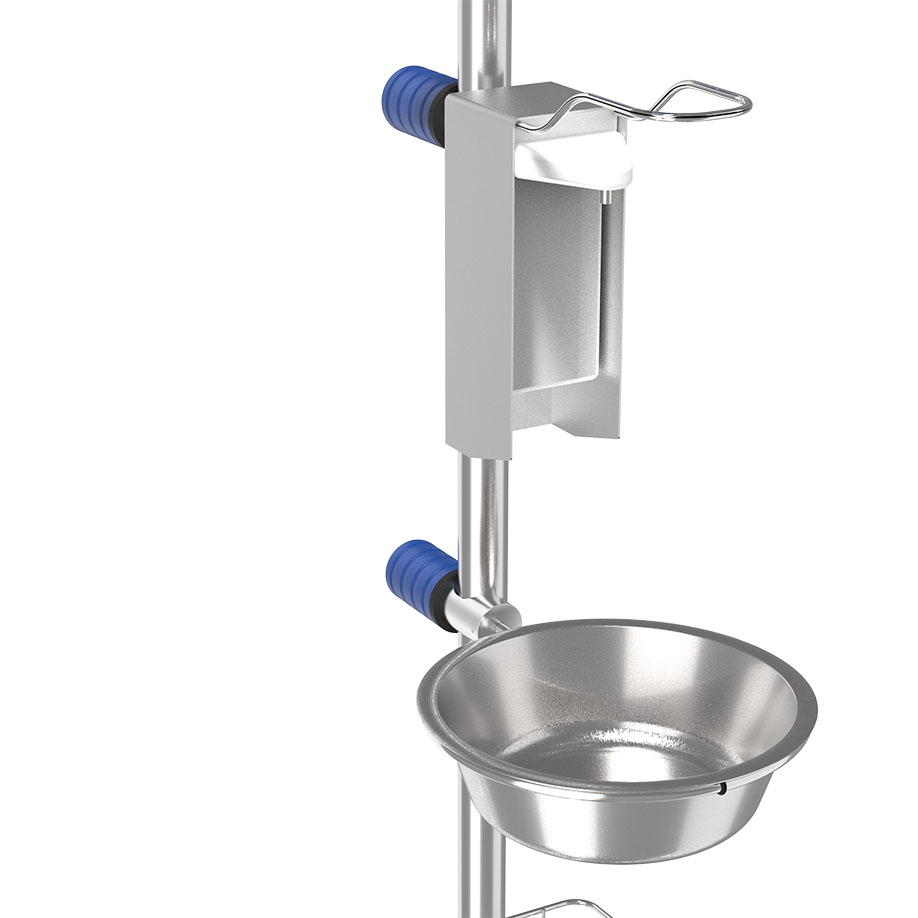 Equipment: holder for 2 glove dispenser, small stainless utensils basket, (W 300 x D 200 X H 100 mm), disinfectant dispender for bottles 500 ml, drip bowl 2 litres, stainless steel storage basket (W 450 x D 450 x H 150 mm).Components are equipped with a quick-hand-fastener or an universal clamp
