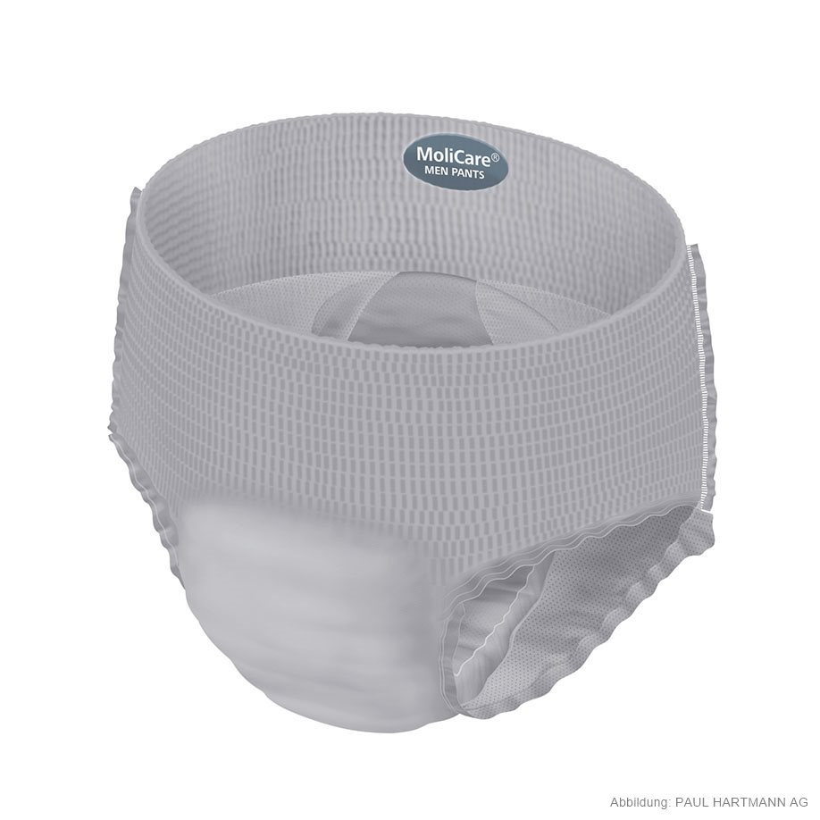 Disposable incontinence briefs specially developed for men with moderate bladder weakness. Discreet wearing comfort thanks to low waistband. MoliCare® Premium MEN pants are wearable like underwear. The grey colour provides a plus in discretion and well-being. Skin-friendly pH value of 5.5 with antibacterial effect.The internal absorbent core has also been adapted to the man's anatomy and placed on the front for rapid fluid absorption. Soft breathable material for maximum wearing comfort. waist measurement: 100 - 150 cm