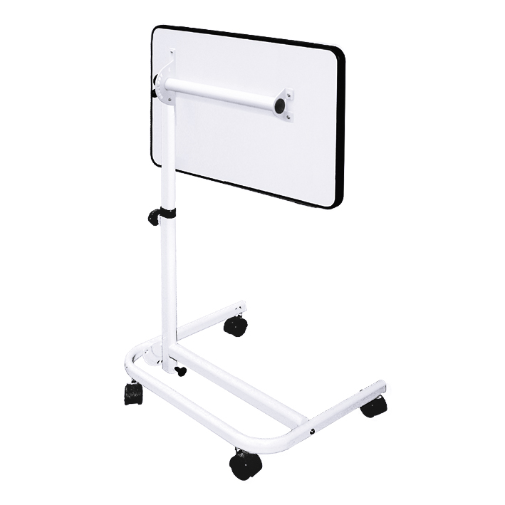 The multifunctional overbed table consists of a plastic-coated table plate with black protective edging also made of plastic and a robust lacquered steel frame with four smooth running double castors, two of them are fixable. Continuously adjustable height from 61 - 94 cm, incline of table plate up to 45° and change to a sloping position of the pillar by pressing a button, size of the tray: 40 x 60 cm, carrying capacity: about. 10 kg, dimensions folded up: 92 x 61 x 11 cm, colour of tray and frame: white.