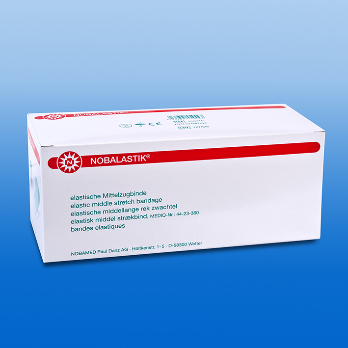 The medically bleached medium-stretch bandage is made of a mix of polyester and elastomer. NOBALASTIK® is suited for the fixation of all sorts of splints. The bandage exerts a supporting and compressing effect in the case of sports injuries. In surgery it is used, for example, for thorax compression in cases of rib fractures or for the stabilization of wound bandages. In the area of phlebology the bandage is employed because of its easy handling, to support treatments.