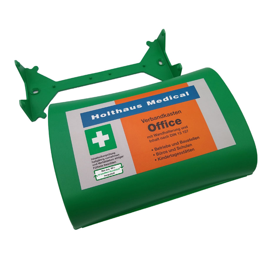 first aid kit made of 95 % recycled plastic with integrated wall bracket