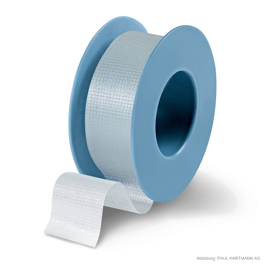 Made of porous, transparent film with polyacrylate adhesive, dirt-repellent; can be torn easily lengthwise and widthwise, on plastic spool. Especially suitable for transparent securing of cannulas or tubes to make it possible to check fluid levels.