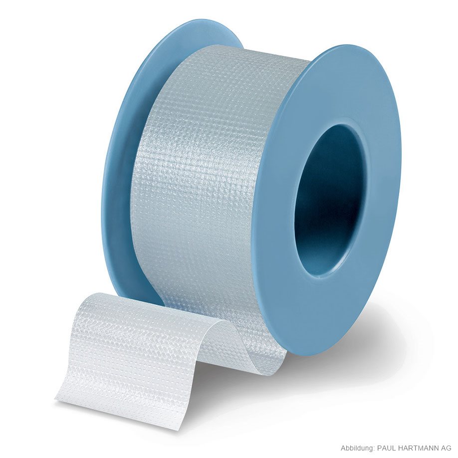 Made of porous, transparent film with polyacrylate adhesive, dirt-repellent; can be torn easily lengthwise and widthwise, on plastic spool. Especially suitable for transparent securing of cannulas or tubes to make it possible to check fluid levels.