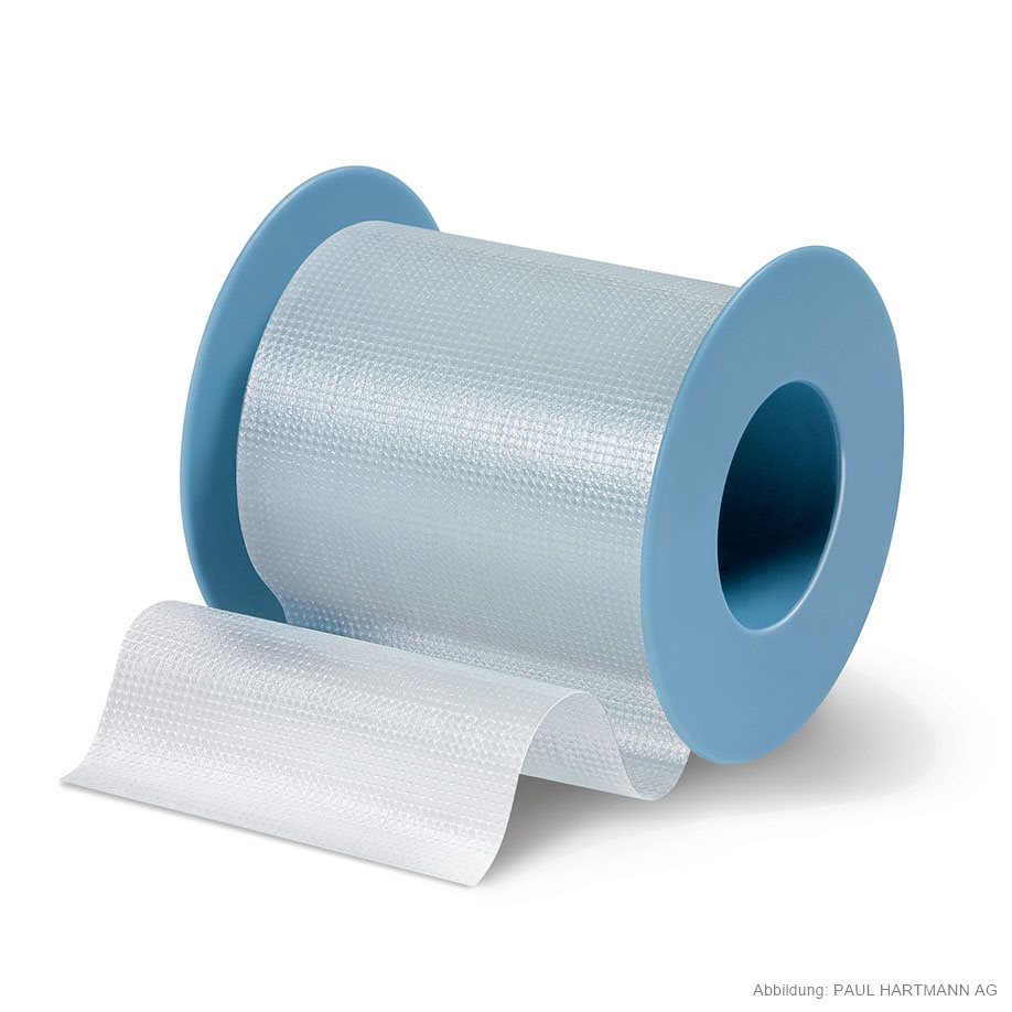 Made of porous, transparent film with polyacrylate adhesive, dirt-repellent; can be torn easily lengthwise and widthwise, on plastic spool. Especially suitable for transparent securing of cannulas or tubes to make it possible to check fluid levels.