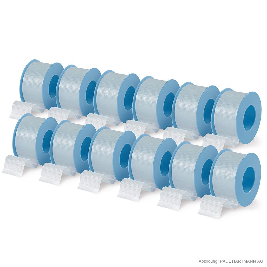 Made of porous, transparent film with polyacrylate adhesive, dirt-repellent, can be torn easily lengthwise and widthwise, on plastic spool. Especially suitable for transparent securing of cannulas or tubes to make it possible to check fluid levels.