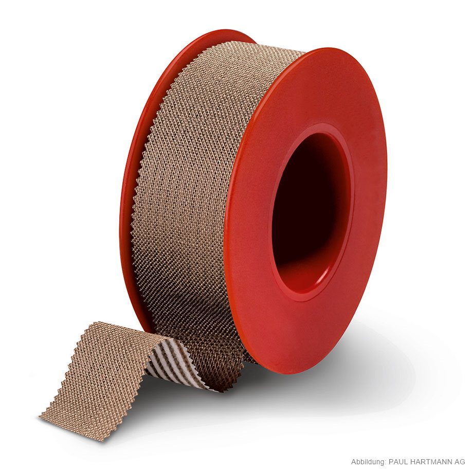 Made of skin-colored textile fabric with synthetic adhesive as strip application, particularly tensile and durable, water repellent impregnated, with zigzag edge.