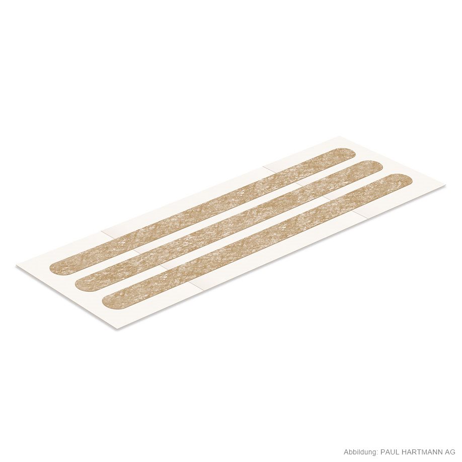 Hypoallergenic wound closure strips made of skin-coloured non-woven fabric with polyacrylate adhesive, with rounded edges, extremely permeable to air and water vapour, no maceration, adhere reliably, can be removed without pain and without leaving residues, radiolucent, temperature resistant and durable, sealed in packs of 10