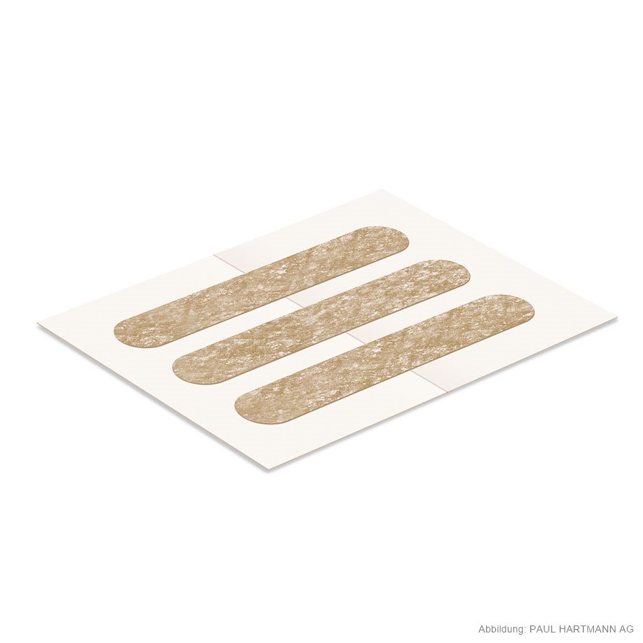 Hypoallergenic wound closure strips made of skin-coloured non-woven fabric with polyacrylate adhesive, with rounded edges, extremely permeable to air and water vapour, no maceration, adhere reliably, can be removed without pain and without leaving residues, radiolucent, temperature resistant and durable, sealed in packs of 6